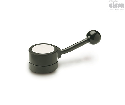 Le levier GN 215 permet d’obtenir la rotation de l’arbre d’un angle donné et par la suite de le bloquer. Pour la rotation de l’arbre le bras est soulevé surmontant la résistance d’un ressort, jusqu’à l’extraction du pointeau de l’encoche (manœuvre d’une seule main). Une limitation de l’angle de manœuvre peut être obtenue au moyen de deux arrêts comme vous le voyez dans le dessin.