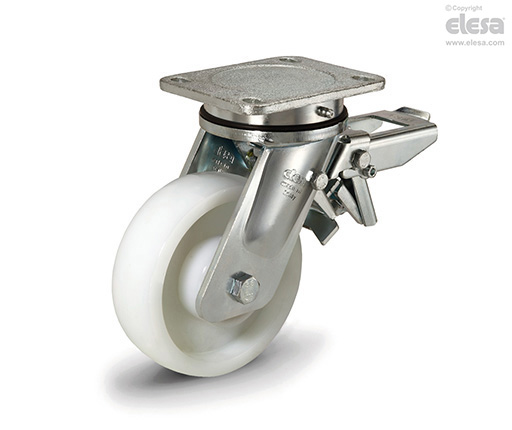 Doppelt wirkender Bremseffekt mit gleichzeitiger Feststellung von Rad und Gehäuse. Die Bremse ist leistungsstark und einfach zu bedienen: ein einfacher Druck mit der Fußspitze von oben nach unten auf zwei unabhängige Pedale sperrt und entsperrt die Bremse, was das Manövrieren extrem einfach macht. Die Wirksamkeit der Bremse kann mit einer Sechskantschraube M8 eingestellt werden.