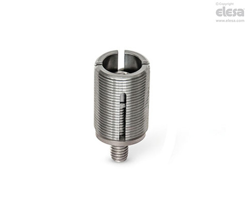 Nach erfolgter Justierung mittels des als Zubehör erhältlichen MontagewerkzeugsGN 355.1 wird die Schraube fest angezogen wodurch sich die Nivellierschraube durch die Kugelscheibe spreizt und somit in der Gewindebohrung gegen Verdrehen gesichert wird.
