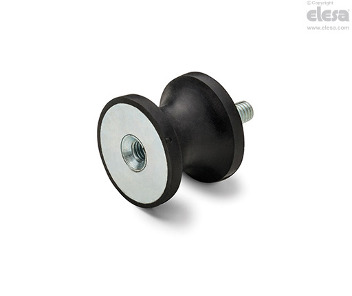 - DVC.2: bushing with threaded blind hole, threaded stud and base plate in polished zinc-plated steel, vibration-damper body in natural rubber NR, black colour, hardness 40, 55, 70 Shore A ±5.