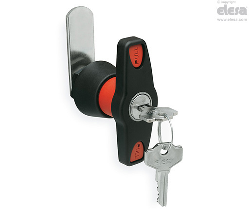 After opening the lock by means of the key (fig. 1) the handle can be turned by pulling the red body towards the operator (fig.2). By turning the handle in the lock position (fig.3), the anti-rotation mechanism is engaged automatically (fig.4).