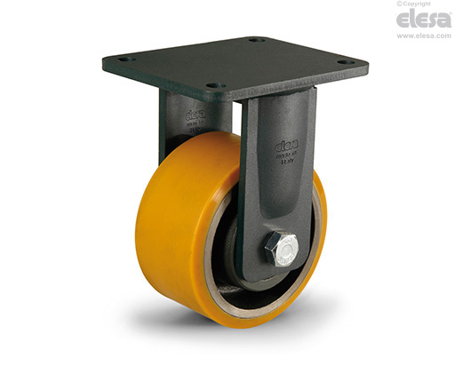 Suitable for heavy industrial applications and severe conditions of use. The mould-on polyurethane wheels ensure excellent rolling resistance and elasticity, high wear and tearing resistance. For further information see wheel technical data sheet RE.F4.