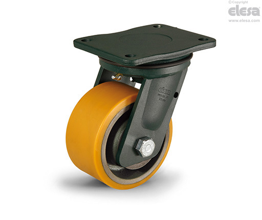 Suitable for heavy industrial applications and severe conditions of use. The mould-on polyurethane wheels ensure excellent rolling resistance and elasticity, high wear and tearing resistance. For further information see wheel technical data sheet RE.F4.