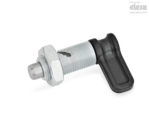 El posicionador de los posicionadores de muelle por palanca GN 712 sobresale cuando está fuera del engranaje. Se usan cuando el posicionador debe replegarse rápidamente. De acuerdo con las versiones (véase dibujo), al girar la palanca hacia la izquierda en 90° o 120°, un pasador lateral que se desliza a lo largo de la hendidura curveada hace que el posicionador se repliegue.