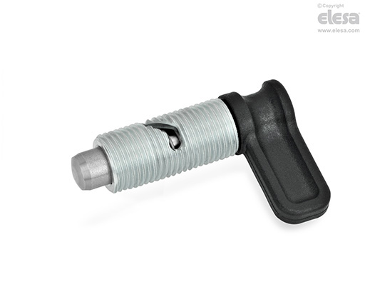 El posicionador de los posicionadores de muelle por palanca GN 712 sobresale cuando está fuera del engranaje. Se usan cuando el posicionador debe replegarse rápidamente. De acuerdo con las versiones (véase dibujo), al girar la palanca hacia la izquierda en 90° o 120°, un pasador lateral que se desliza a lo largo de la hendidura curveada hace que el posicionador se repliegue.