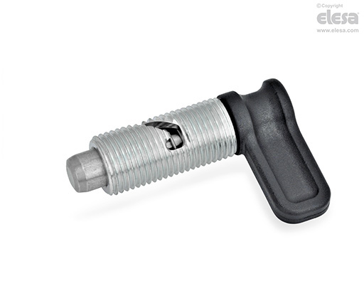 El posicionador de los posicionadores de muelle por palanca GN 712 sobresale cuando está fuera del engranaje. Se usan cuando el posicionador debe replegarse rápidamente. De acuerdo con las versiones (véase dibujo), al girar la palanca hacia la izquierda en 90° o 120°, un pasador lateral que se desliza a lo largo de la hendidura curveada hace que el posicionador se repliegue.