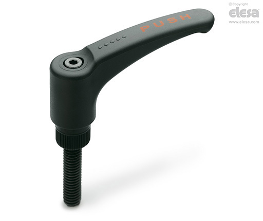 Elemento de fijación de tecnopolímero reforzado con fibra de vidrio, color negro, con moleteado en la parte saliente para facilitar el ajuste inicial. Tornillo, muelle de retorno de acero inoxidable AISI 302.