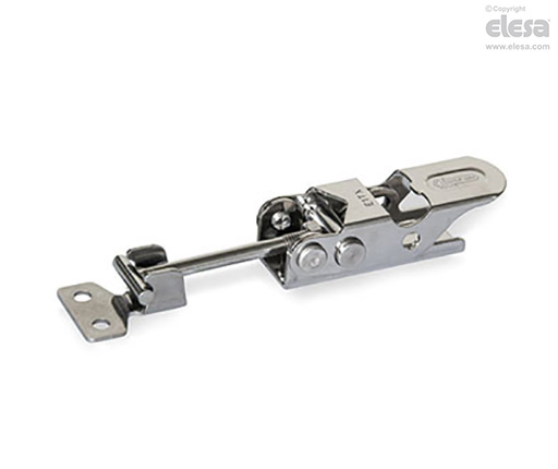 Lorsque le levier est fermé, la configuration excentrique du goujon de la tige provoque le déplacement du loquet vers la butée. À la fin du mouvement du levier, le goujon de la tige a dépassé son point mort excentrique, en gardant fermé automatiquement le pêne demi-tour pour sauterelles.