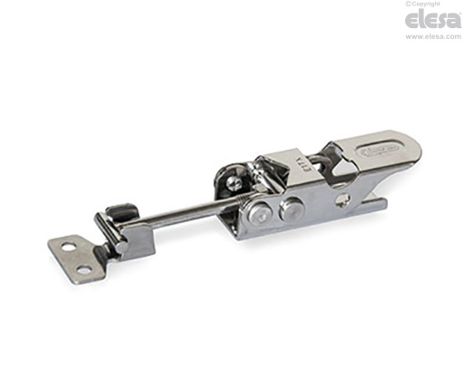 Lorsque le levier est fermé, la configuration excentrique du goujon de la tige provoque le déplacement du loquet vers la butée. À la fin du mouvement du levier, le goujon de la tige a dépassé son point mort excentrique, en gardant fermé automatiquement le pêne demi-tour pour sauterelles.