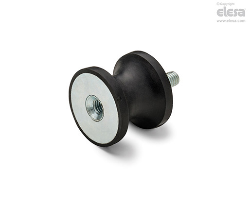 - DVC.2: boccola con foro cieco filettato, prigioniero filettato e piastra base in acciaio zincato lucido, corpo antivibrante in gomma naturale NR, colore nero, durezze 40, 55, 70 Shore A ±5.