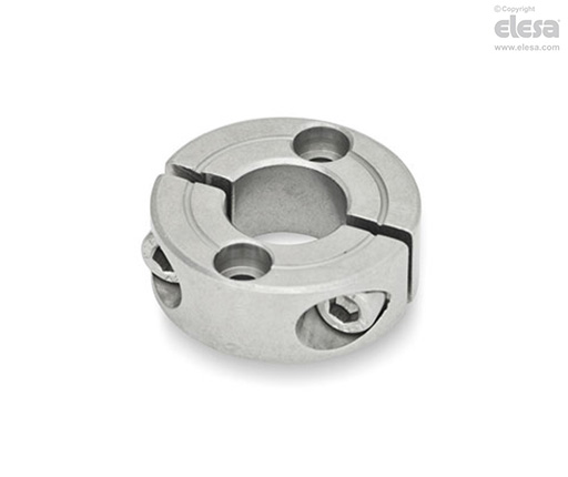 Gli anelli di posizionamento scomponibili GN 7072.2 vengono assemblati e fissati all'albero avvitando opportunamente le viti. I fori passanti consentono il fissaggio assiale di alberi a ruote, pignoni o corpi macchina.