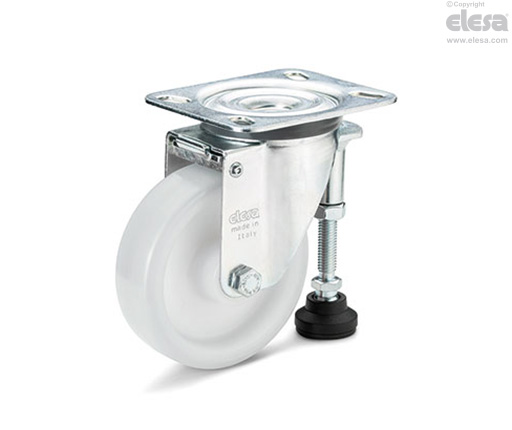 La ruota con piedino antiscivolo permette di sollevare carrelli o macchinari per poter operare in sicurezza, garantendo allo stesso tempo la possibilità di effettuare frequenti spostamenti tramite semplice regolazione dell’esagono del piedino, trasformando di fatto postazioni e apparecchiature da lavoro fisse in postazioni mobili.