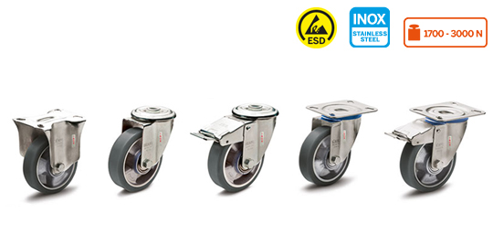RE.F5-SST-N-ESD Roulettes avec monture en acier INOX et bandage polyuréthane certifié ESD | Le polyuréthane spécial, d'une résistivité électrique < 10° Ω, empêche l'accumulation de charges électrostatiques. Les roues RE.F5-SST-N-ESD sont donc adaptées aux applications en « ZONES PROTÉGÉES ESD ». Tous les composants sensibles aux décharges électrostatiques doivent être traités avec un risque minimal de dommages. De plus, l'utilisation de roulements et de platines en acier inoxydable réduit considérablement le risque d'étincelles lors de la manipulation. Les spécifications électriques sont conformes aux exigences de la norme ISO 22878:2004. |