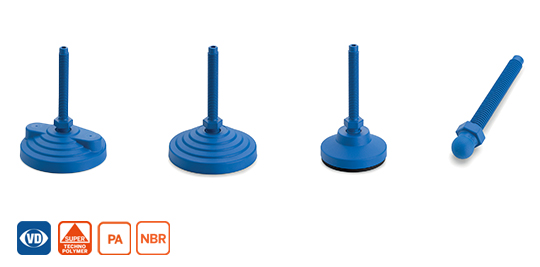 The new levelling feet are produced from FDA compliant raw material (FDA CFR.21 and EU 10/2011) and coloured in RAL 5005 blue, which meets the standard colour of the food and pharmaceutical machinery. Thanks to the property of the SUPER-technopolymer stem, high rigidity and mechanical resistance are obtained in addition to natural resistance to corrosion. The special knurling under the lower lip of the base provides excellent stability and grip when using the levelling element without no-slip disk even on surfaces that are not perfectly flat. |