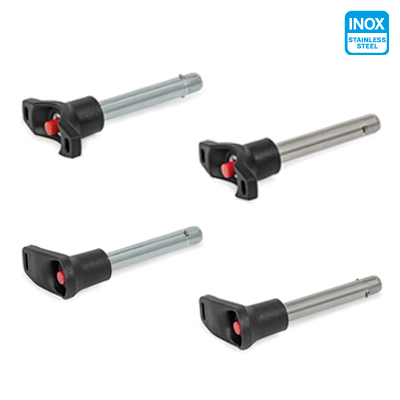 The lock pins allow to quickly attach, connect, and secure various components; they operate by pressing the red acetal-based button, which enables the insertion or removal of the lock pin. The new GN 114.12 and GN 114.8 series are made with a pin, pawls, and spring in stainless steel; while the GN 114.11 and GN 114.7 series feature a pin in blue passivated zinc-plated steel, and pawls and spring in stainless steel. Depending on the model, the handle is available in a "T" or "L" shape.