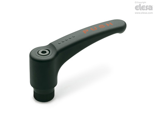 Glasfiberförstärkt polyamidbaserad (PA) teknopolymer, gråsvart, matt yta. Röd text "PUSH" tryckt på spaken (undvik kontakt med lösningsmedel, alkohol eller rengöringsmedel som innehåller alkohol).