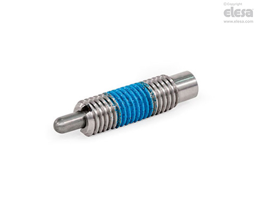 Gängad kropp av AISI 303 rostfritt stål, delvis täckt med PBF polyamidbeläggning (se Tekniska data), blå färg, för omedelbar låsning av gängor. Låspinne i AISI 303 rostfritt stål: